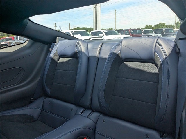 This Mustang Dark Horse is nicely equipped with Dark Horse Appearance Package (Notorious Blue Painted Brake Calipers, Painted Black Roof, and Unique Hood Graphic), Equipment Group 700A Deluxe Package (Aluminum Foot Pedals, Approach Detection, Cloth/Vinyl Climate-Controlled Bucket Seats, Driver Seat & Mirrors Memory, and Universal Garage Door Opener (UGDO)), Security Package (Active Anti-Theft System, Locking Center Console, and Wheel Locking Kit), 12 Speakers, 4-Wheel Disc Brakes, ABS brakes, Adaptive suspension, Air Conditioning, Alloy wheels, AM/FM radio: SiriusXM with 360L, AM/FM Stereo, Auto High-beam Headlights, Auto-dimming Rear-View mirror, Automatic temperature control, B&O Sound System by Bang & Olufsen, Brake assist, Bumpers: body-color, Cloth/Vinyl Heated Bucket Seats, Compass, Delay-off headlights, Driver door bin, Driver vanity mirror, Dual front impact airbags, Dual front side impact airbags, Electronic Stability Control, Emergency communication system: 911 Assist, Exterior Parking Camera Rear, Four wheel independent suspension, Front anti-roll bar, Front Bucket Seats, Front Center Armrest, Front dual zone A/C, Front reading lights, Fully automatic headlights, HD Radio, Heated front seats, Heated steering wheel, Illuminated entry, Knee airbag, Low tire pressure warning, Navigation system: Connected Navigation, Occupant sensing airbag, Outside temperature display, Overhead airbag, Overhead console, Panic alarm, Passenger door bin, Passenger vanity mirror, Power door mirrors, Power driver seat, Power passenger seat, Power steering, Power windows, Premium Floor Liners Front & Rear (w/Carpet Mats), Radio data system, Rain sensing wipers, Rear anti-roll bar, Rear Parking Sensors, Rear window defroster, Remote keyless entry, SiriusXM w/360L, Speed control, Speed-sensing steering, Speed-Sensitive Wipers, Split folding rear seat, Spoiler, Sport steering wheel, Steering wheel mounted audio controls, SYNC 4, Tachometer, Telescoping steering wheel, Tilt steering wheel, Traction control, Trip computer, Variably intermittent wipers, Voltmeter, and Wheels: 19 x 9.5 Fr & 19 x 10 Rr Aluminum.