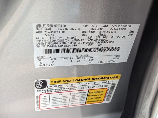 This Navigator Reserve is nicely equipped with Equipment Group 300A Reserve, GVWR: 7,625 lbs Payload Package, 4WD, Ebony Leather, 14 Speakers, 1st & 2nd Row All-Weather Floor Liners, 2nd Row Heated 40/20/40 Split Bench Seat, 3.73 Axle Ratio, 30-Way Perfect Position Seating w/Active Motion, 3rd row seats: split-bench, 4-Wheel Disc Brakes, ABS brakes, Adaptive suspension, Adjustable pedals, Air Conditioning, Alloy wheels, AM/FM radio: SiriusXM, AppLink/Apple CarPlay and Android Auto, Audio memory, Auto High-beam Headlights, Auto tilt-away steering wheel, Auto-dimming door mirrors, Auto-dimming Rear-View mirror, Auto-leveling suspension, Automatic temperature control, Bodyside moldings, Brake assist, Bumpers: body-color, Compass, Delay-off headlights, Driver door bin, Driver vanity mirror, Driver's Seat Mounted Armrest, Dual front impact airbags, Dual front side impact airbags, Electronic Stability Control, Emergency communication system: 911 Assist, Exterior Parking Camera Rear, Four wheel independent suspension, Front anti-roll bar, Front Bucket Seats, Front dual zone A/C, Front fog lights, Front reading lights, Fully automatic headlights, Garage door transmitter: HomeLink, Genuine wood dashboard insert, Genuine wood door panel insert, Heads-Up Display, Heated door mirrors, Heated front seats, Heated rear seats, Heated steering wheel, HVAC memory, Illuminated entry, Leather steering wheel, Low tire pressure warning, Memory seat, Navigation System, Occupant sensing airbag, Outside temperature display, Overhead airbag, Overhead console, Panic alarm, Passenger door bin, Passenger seat mounted armrest, Passenger vanity mirror, Pedal memory, Power adjustable rear head restraints, Power door mirrors, Power driver seat, Power Liftgate, Power moonroof: Panoramic Vista Roof, Power passenger seat, Power steering, Power windows, Premium Lthr Htd/Ventilated Low-Back Bucket Seats, Radio data system, Radio: Revel AM/FM/HD/MP3 Audio System, Rain sensing wipers, Rear air conditioning, Rear anti-roll bar, Rear audio controls, Rear reading lights, Rear window defroster, Rear window wiper, Reclining 3rd row seat, Remote keyless entry, Revel Ultima Audio System w/20 Speakers, Roof rack: rails only, Security system, SiriusXM Radio, Speed control, Speed-sensing steering, Speed-Sensitive Wipers, Split folding rear seat, Spoiler, Steering wheel memory, Steering wheel mounted audio controls, SYNC 3 Communications & Entertainment System, Tachometer, Telescoping steering wheel, Tilt steering wheel, Traction control, Trip computer, Turn signal indicator mirrors, Variably intermittent wipers, Ventilated front seats, and Wheels: 22 16-Spoke Ultra Bright Machined Alum Price does not include dealer-installed equipment. Price(s) include(s) all costs to be paid by a consumer, except for licensing costs, registration fees, $799 administrative fees, taxes, and $798 Triton VIP Protection Plan.
